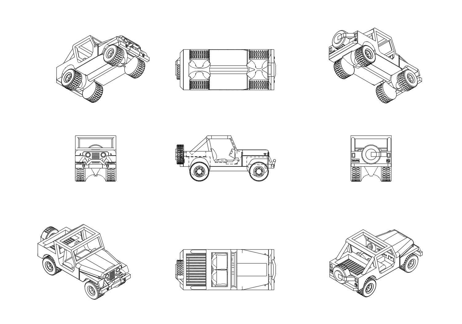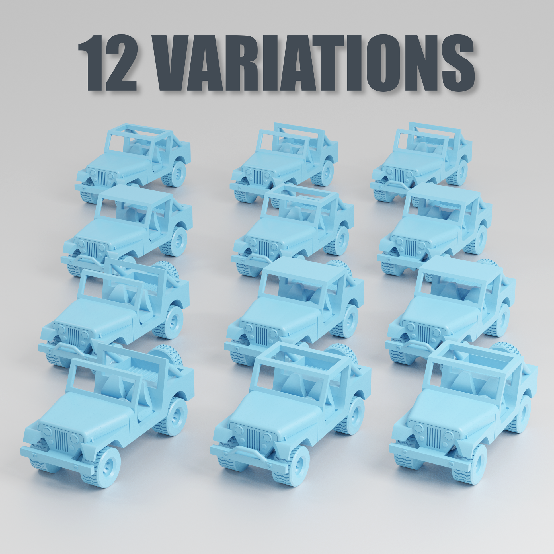 This download includes 12 different variations of the model, allowing you to choose your favorite. The variations included different roof types, bumper guards, and optional spare tires on the back.