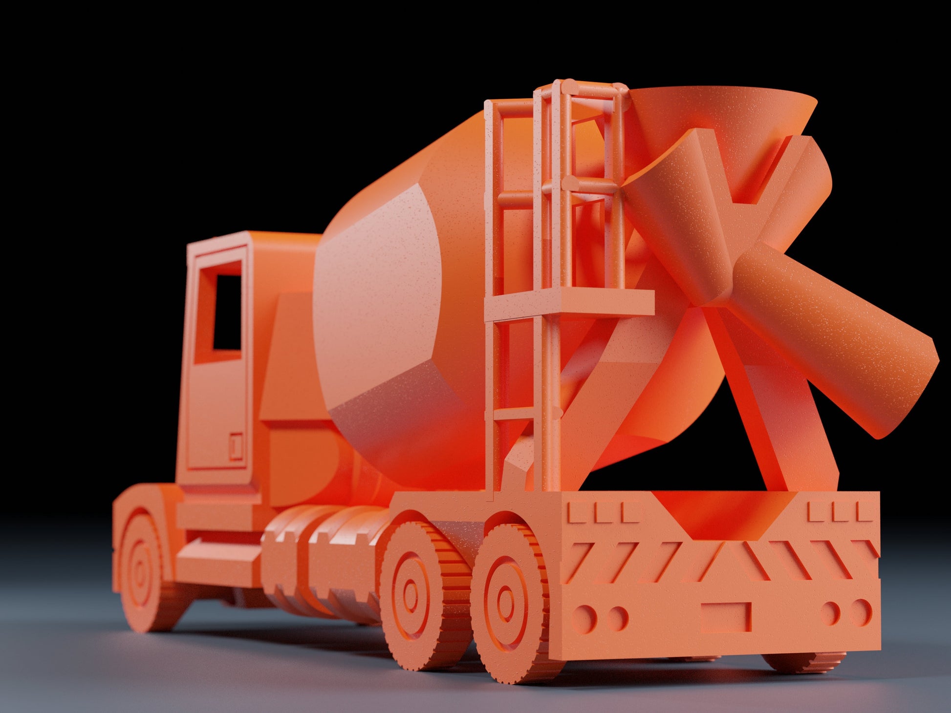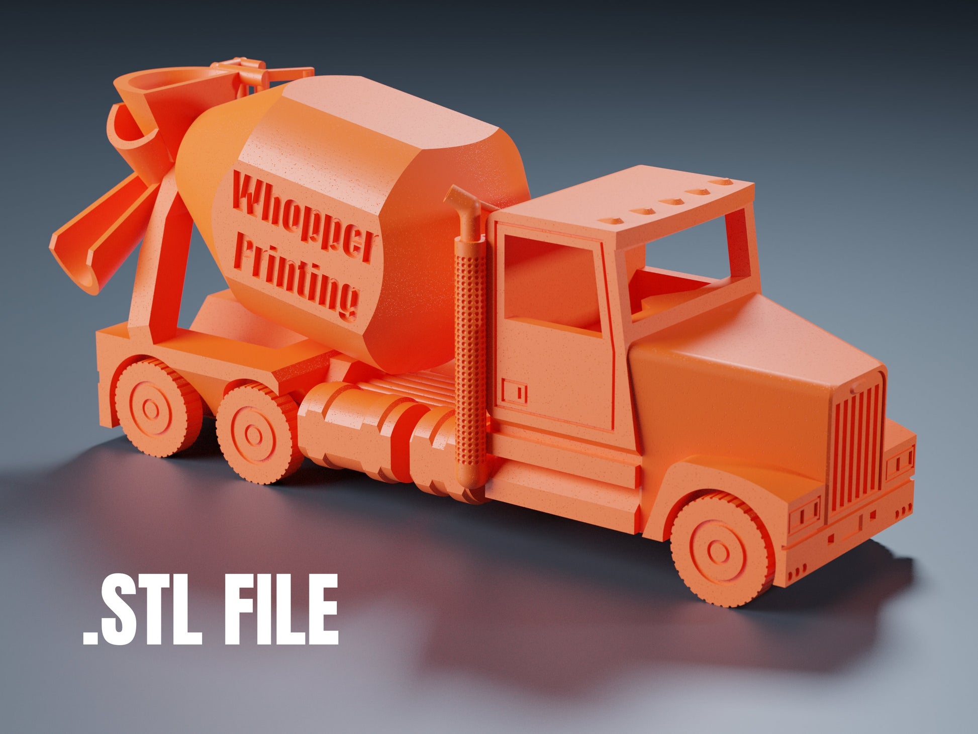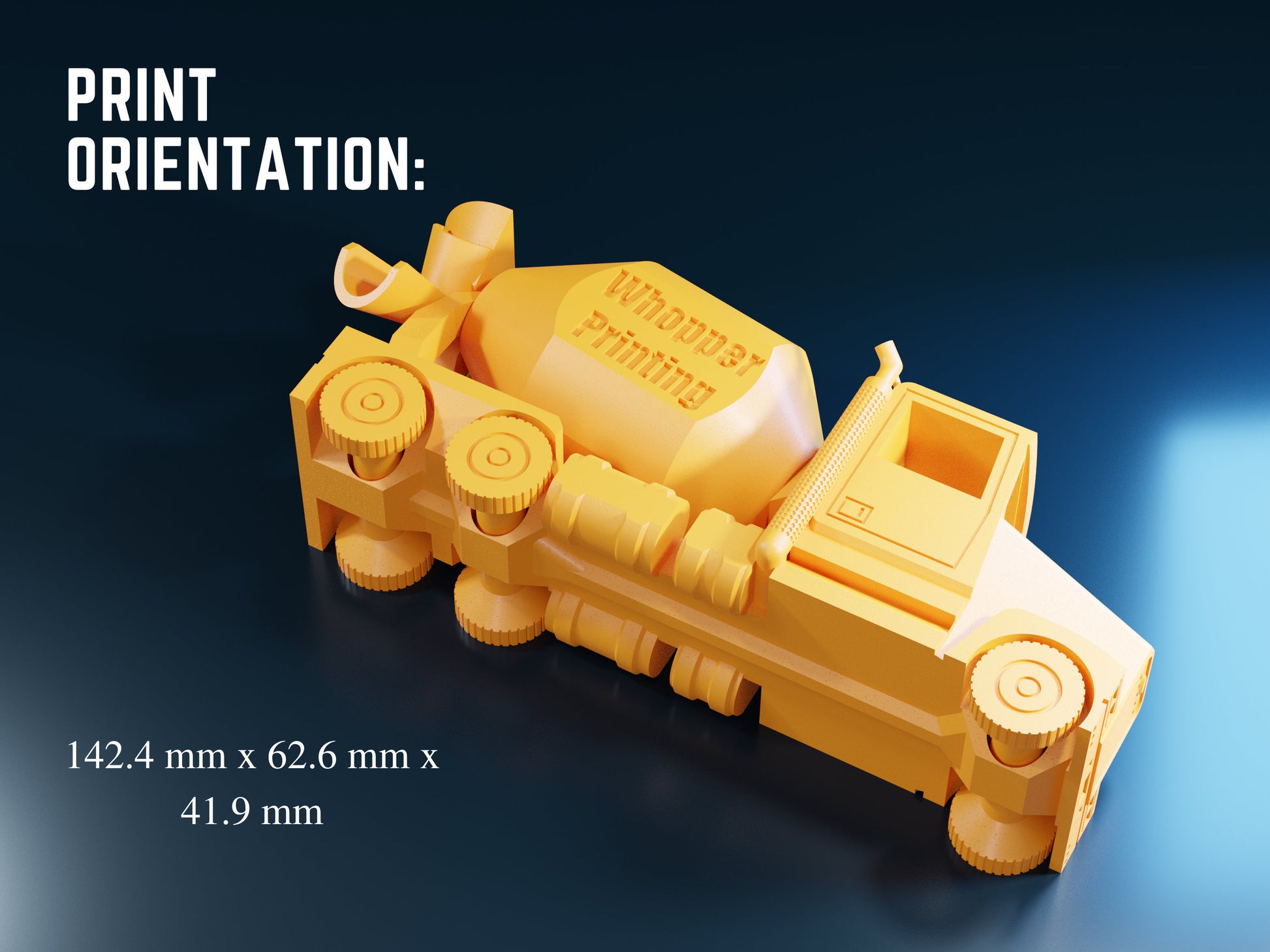 This concrete mixer truck includes 3 moving axles, or 6 wheels, and a functional spinning drum!