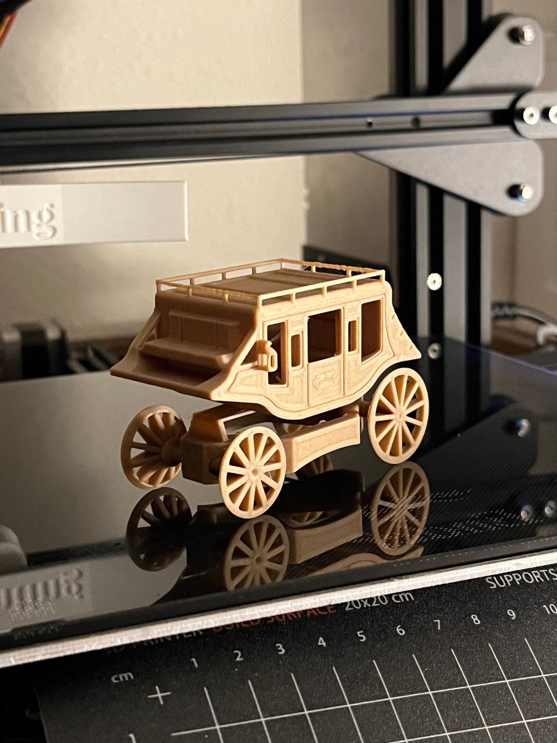 This stagecoach is a detailed model that prints in one single piece. It also has a working suspension!